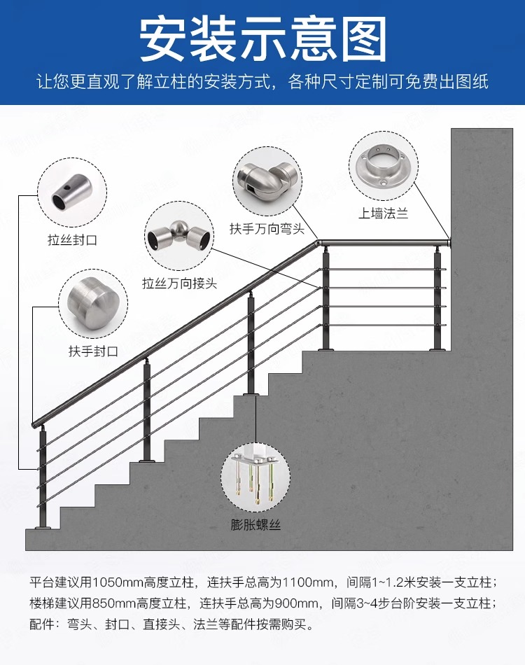 栏杆高度(一般在 900mm-1200mm之间,具体规格可按用途设定)